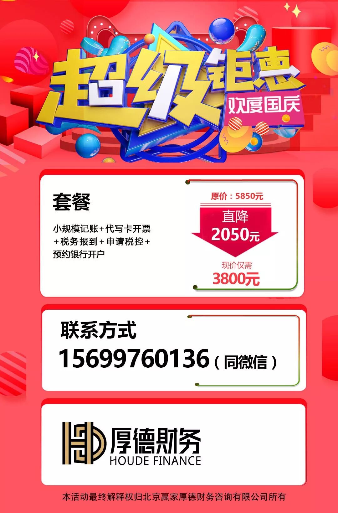 目前,赢家厚德财务正在举办“国庆钜惠”促销活动,希望用货真价实的服务,解决广大新老客户财务难题。
